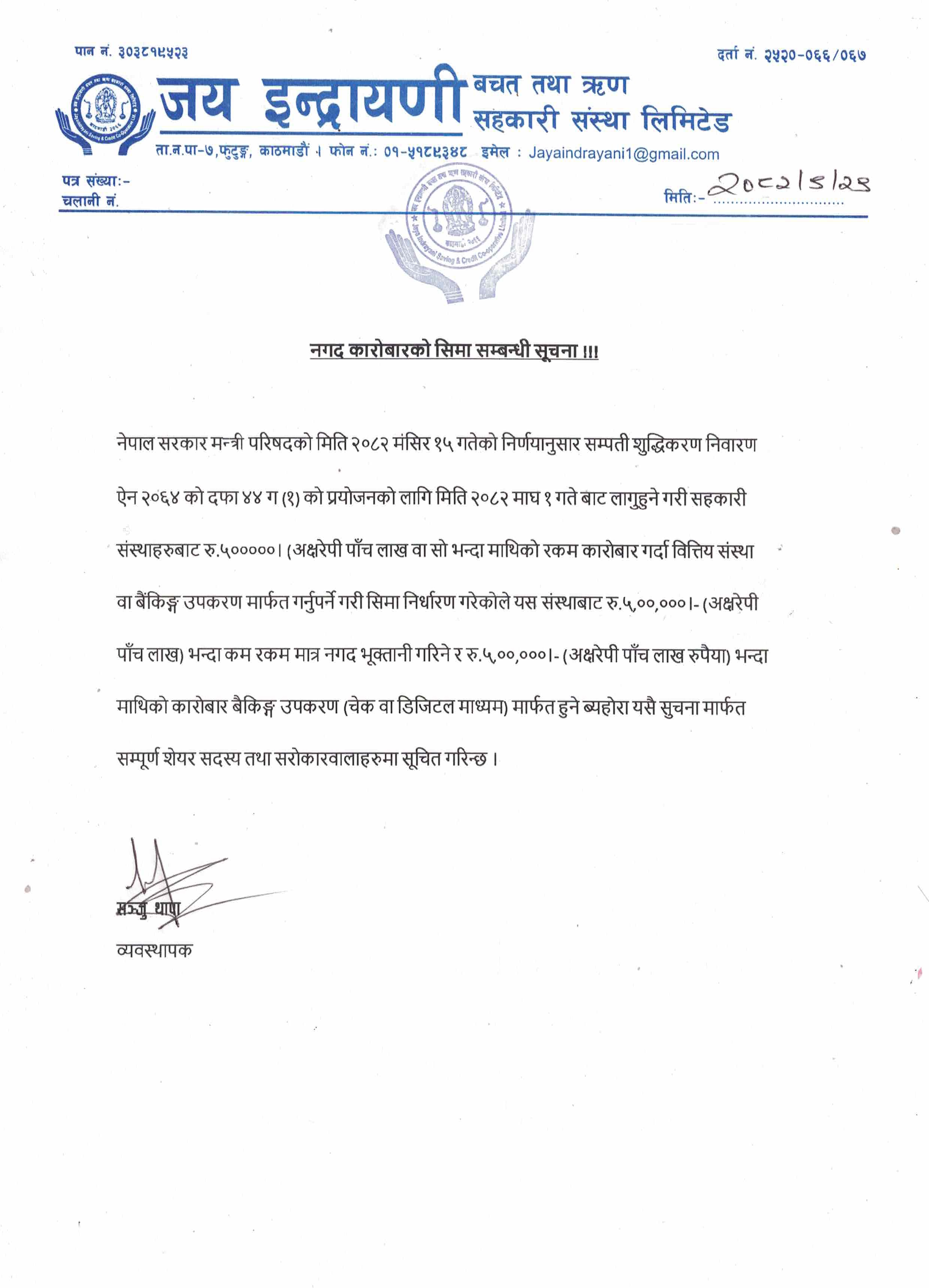 नेपालमा सहकारी अभियानको विभिन्न चरणहरुका बावजुद २०४६ सालको प्रजातन्त्रको पुर्नस्थपना पश्चात सहकारी ऐन २०४८ जारी भयो र सहकारी संस्थाहरुको विकासको लहर तदारुकताका साथ आयो । मुलुकमा थुप्रै सहकारी संस्थाहरु विभिन्न प्रकारका एकल उद्देश्य तथा बहुउद्देश्य सहकारी संंस्थाहरुको स्थापना र सञ्चालन हुन शुरु भयो । यसै शिलशिलामा फुटुङ्ग, साङ्गला ,मनमैजु , धर्मस्थली र काभ्रेस्थली कार्यक्षेत्र रहेने गरी तात्कालीन ५ गा. वि. स. का २८ जना व्यक्तिहरु मिलेर २०६६ सालमा जय ईन्द्रायणी वचत तथा ऋण सहकारी संस्था स्थापना भयो ।